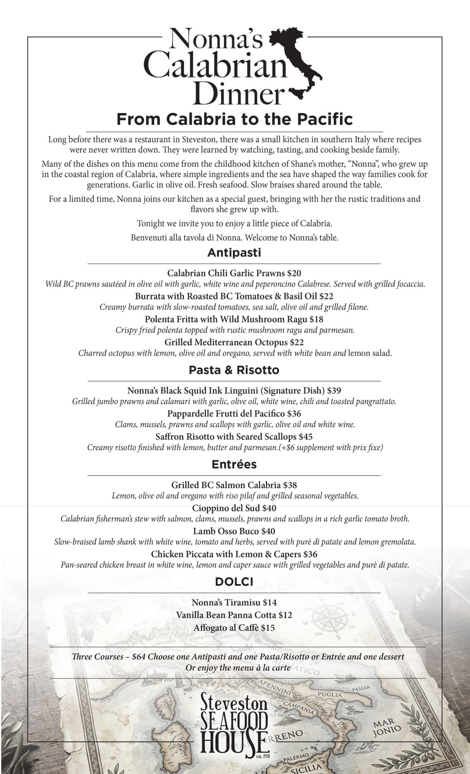 Long before there was a restaurant in Steveston, there was a small kitchen in southern Italy where recipes were never written down. They were learned by watching, tasting, and cooking beside family.